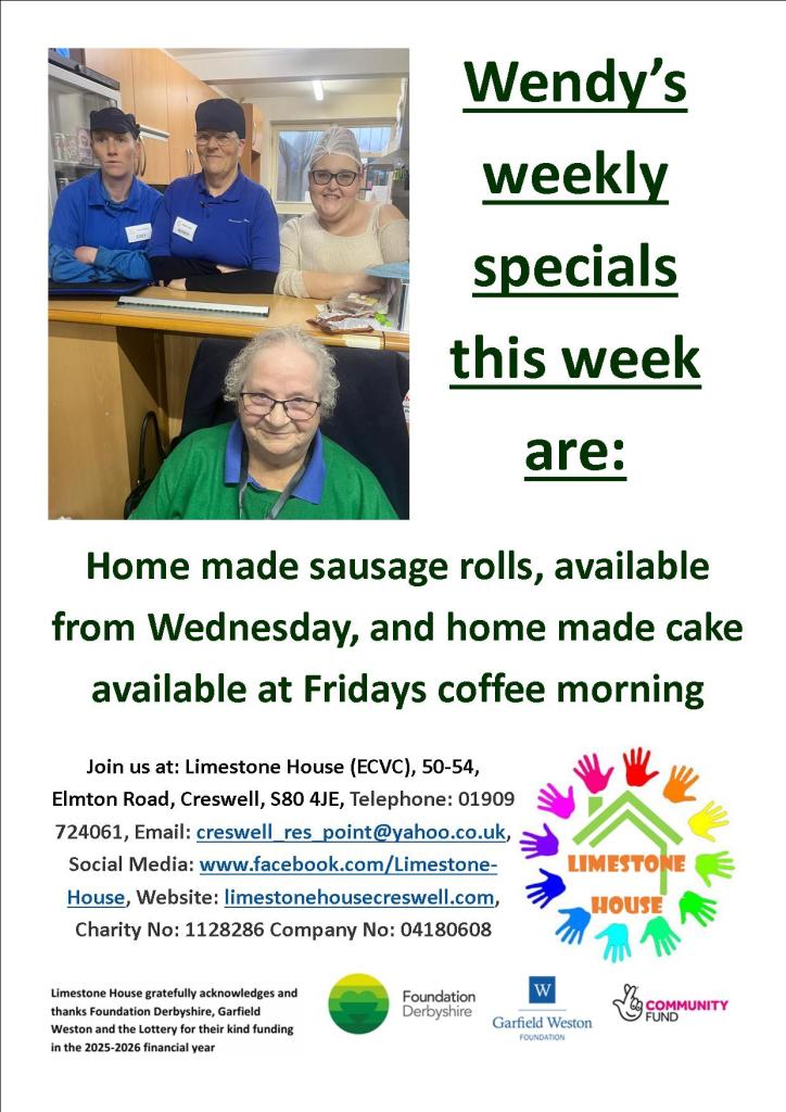 50-54, Elmton Road, Creswell, S80 4JE, Telephone: 01909 724061 Email: creswell_res_point@yahoo.co.uk, Social Media: www.facebook.com/Limestone-House, Website: limestonehousecreswell.com, Charity No: 1128286 Company No: 04180608. (EDUCATION, TRAINING. THE PREVENTION OR RELIEF OF POVERTY, ENVIROMENTAL, CONSERVATION, HERITAGE, ECOOMIC, COMMUNITY DEVELOPMENT, EMPLOYMENT)
