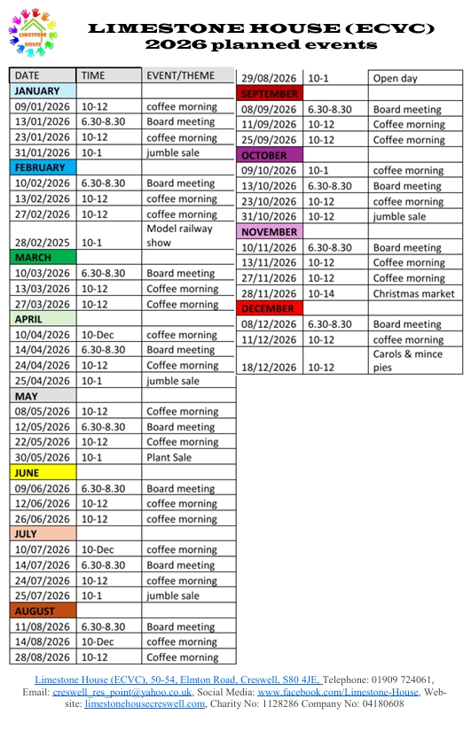 50-54, Elmton Road, Creswell, S80 4JE, Telephone: 01909 724061 Email: creswell_res_point@yahoo.co.uk, Social Media: www.facebook.com/Limestone-House, Website: limestonehousecreswell.com, Charity No: 1128286 Company No: 04180608. (EDUCATION, TRAINING. THE PREVENTION OR RELIEF OF POVERTY, ENVIROMENTAL, CONSERVATION, HERITAGE, ECOOMIC, COMMUNITY DEVELOPMENT, EMPLOYMENT)