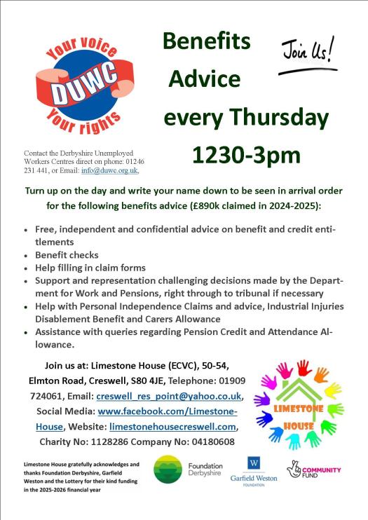 Over many years Creswell residents have been supported with Benefits Advice, and more, by the Derbyshire Unemployed Workers Centre team every Thursday afternoon 12.30-3pm.