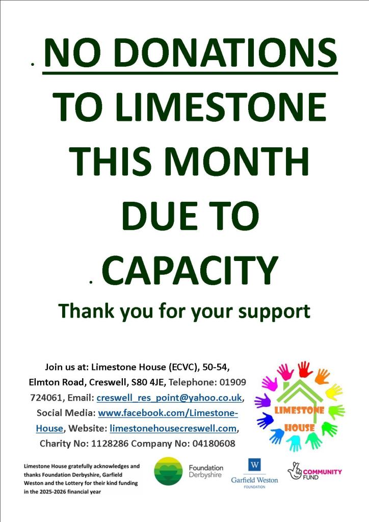 50-54, Elmton Road, Creswell, S80 4JE, Telephone: 01909 724061 Email: creswell_res_point@yahoo.co.uk, Social Media: www.facebook.com/Limestone-House, Website:Â limestonehousecreswell.com, Charity No: 1128286 Company No: 04180608. (EDUCATION, TRAINING. THE PREVENTION OR RELIEF OF POVERTY, ENVIROMENTAL, CONSERVATION, HERITAGE, ECOOMIC, COMMUNITY DEVELOPMENT, EMPLOYMENT)