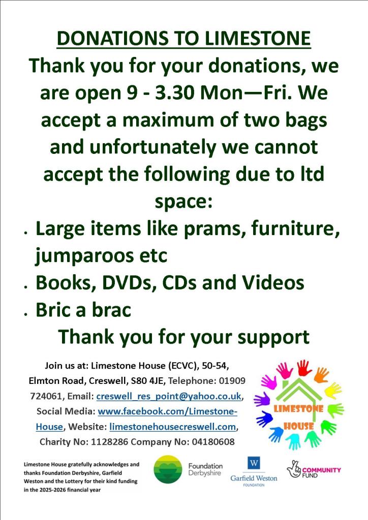 50-54, Elmton Road, Creswell, S80 4JE, Telephone: 01909 724061 Email: creswell_res_point@yahoo.co.uk, Social Media: www.facebook.com/Limestone-House, Website: limestonehousecreswell.com, Charity No: 1128286 Company No: 04180608. (EDUCATION, TRAINING. THE PREVENTION OR RELIEF OF POVERTY, ENVIROMENTAL, CONSERVATION, HERITAGE, ECOOMIC, COMMUNITY DEVELOPMENT, EMPLOYMENT)